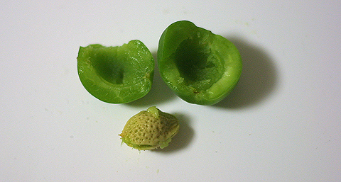 세척한후 물기를 빼고 도마나 대리석위에 매실을 세워놓고 돌로 내려칩니다.