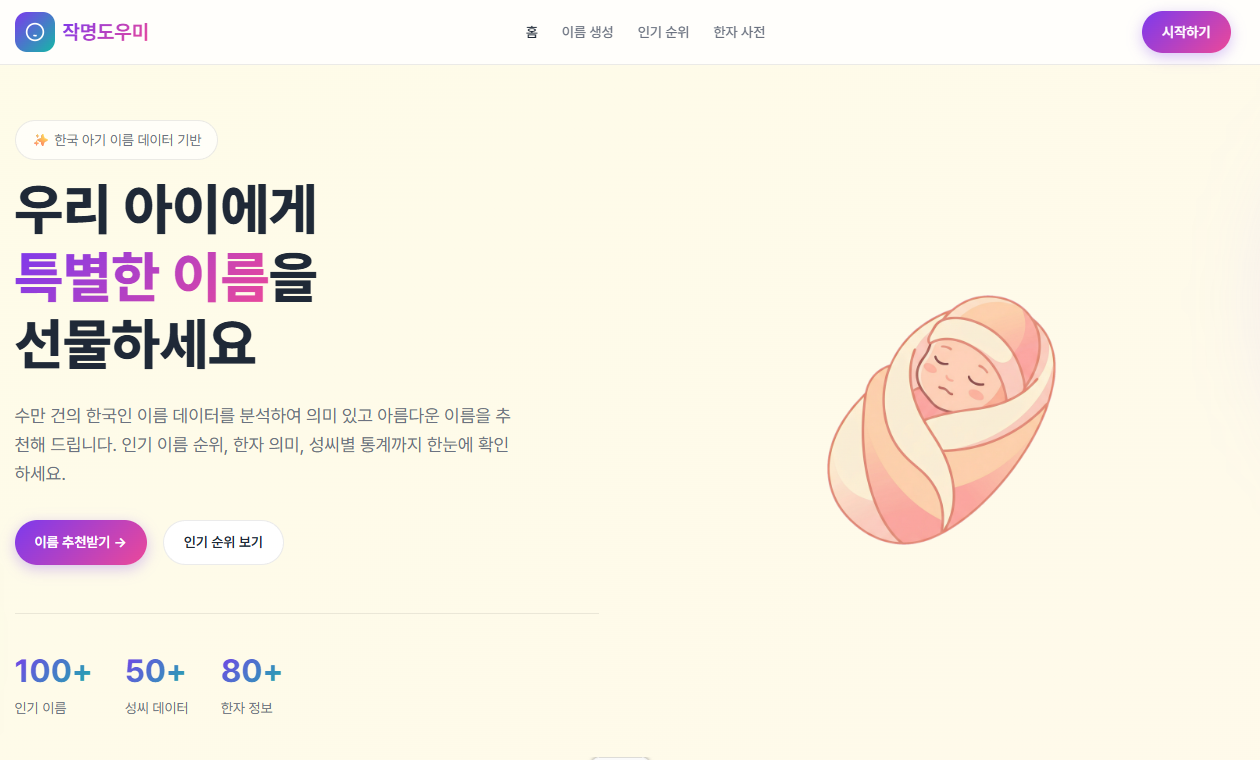 한국인 이름 데이터를 기반으로 아기 이름을 추천하고 작명을 도와주는 서비스입니다. 인기 이름 순위, 한자 의미, 성씨별 통계를 확인하세요.