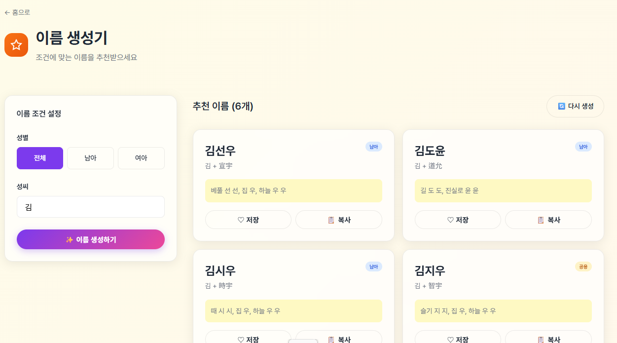 아이 이름을 무료로 만들어볼 수 있는 사이트예요.