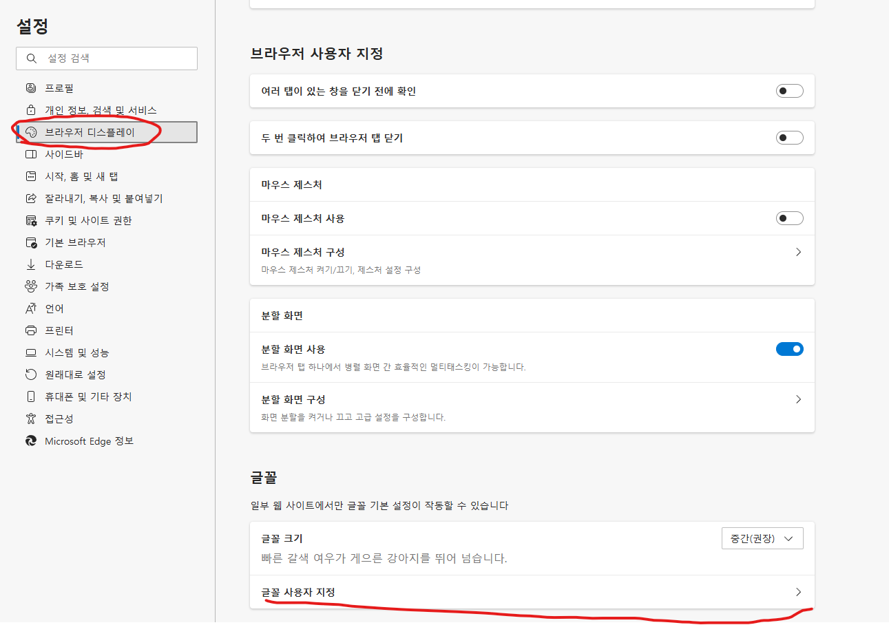 2. 브라우저 디스플레이 의 가장 하단으로 가서 글꼬 사용자 지정을 클릭한다.
