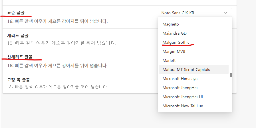 3. 표준 글꼴과 산세리프 글꼴을 Malgun Gothic으로 변경하면 기존처럼 얇은글씨로 보여지게 된다.