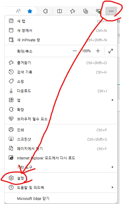 1. 맨 우측의 메뉴(...)을 눌러 설정으로 들어간다.