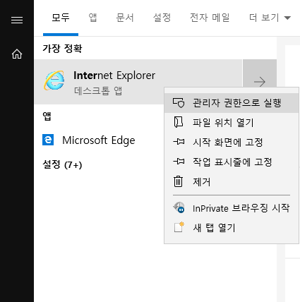 이런 사이트들은 익스플로어를 우클릭해서 관리자 모드로 실행한후 설치하시면 설치가 잘 되실거예요.