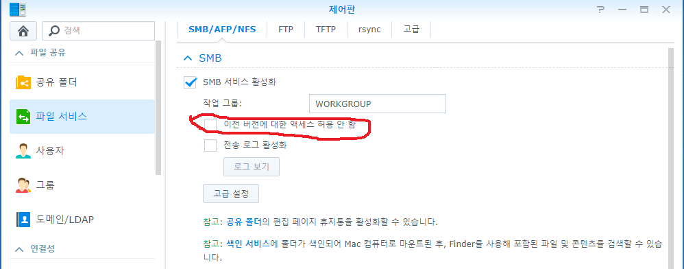 제어판에 - 파일서비스 - smb의 이전버전에 대한 액세서 허용 안 함이 체크되어 있을 경우