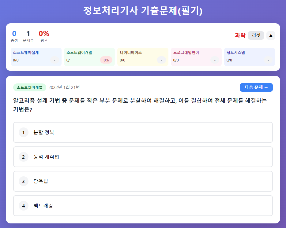 정보처리기사 필기 기출문제를 랜덤으로 풀어보세요. 과목별 점수와 합격 여부를 실시간으로 확인할 수 있습니다.
